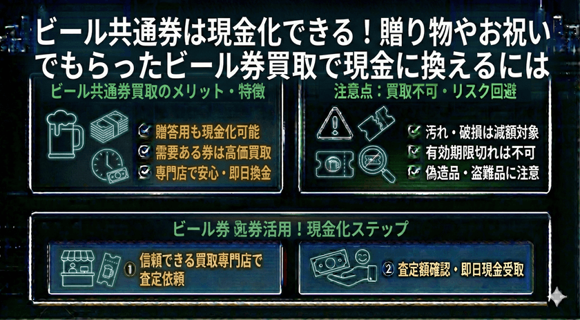 ビール共通券を現金化する具体的な方法から、それぞれのメリット・デメリット、そして注意点までを詳しく解説します。